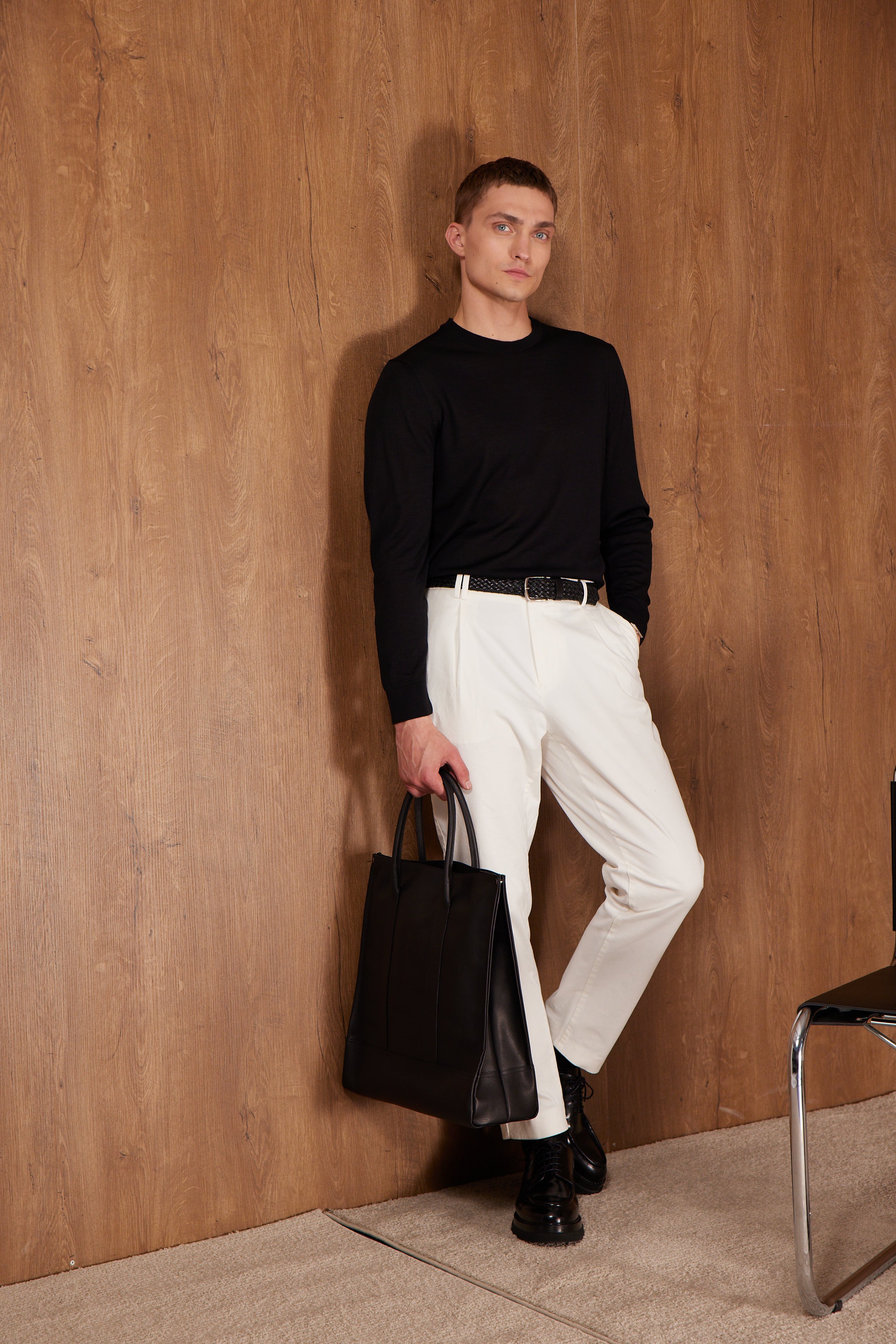 İtalyan ipliğiyle dokunan bu slim fit bisiklet yaka triko, minimal çizgiyi zarif bir duruşla buluşturan modern bir görünüm sunar.